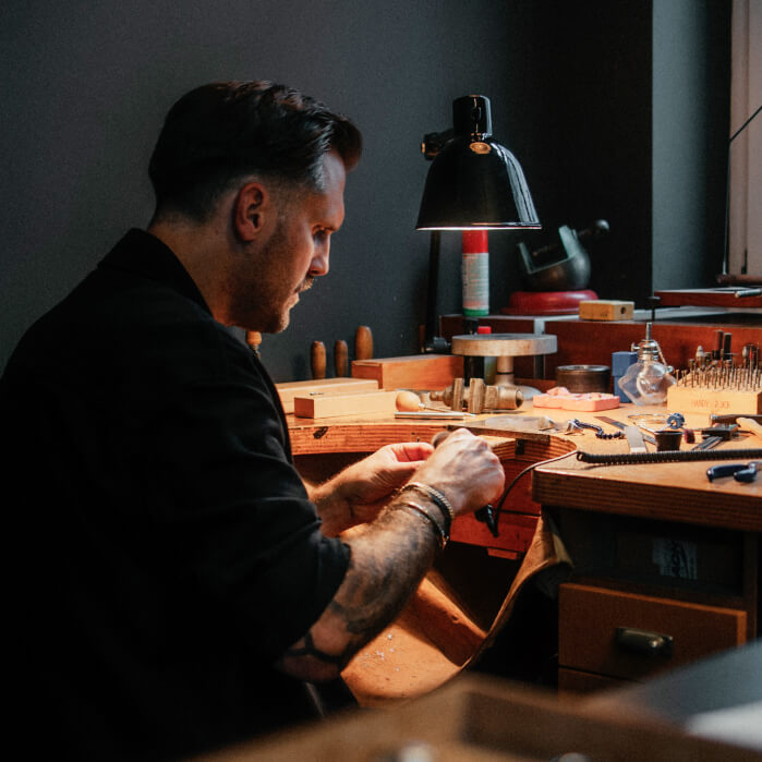 Growing up in the gold city of Pforzheim, Ralf Kellenberger combines old stories with modern aesthetics in his jewelry. Inspired by vintage shops and Frankfurt architecture, he brings forgotten things back to life and creates jewelry with character – timeless and full of meaning.